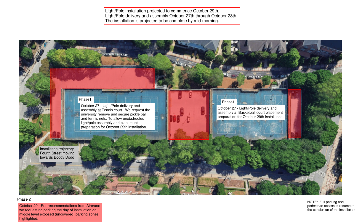 Logistics plan for parking restriction during helicopter assisted light pole installation on Peters parking deck.
