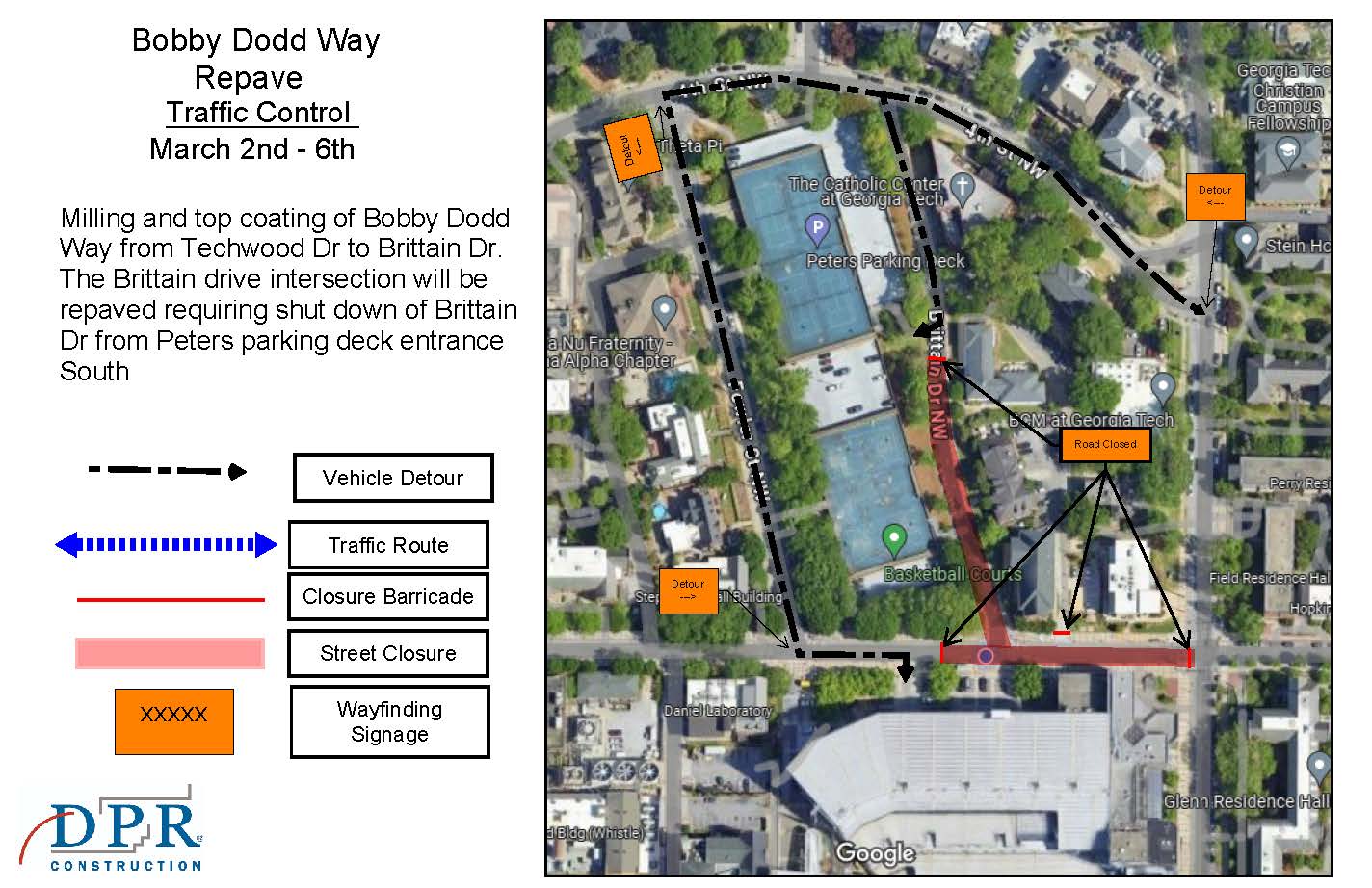 - On Brittain Drive, paving will occur from the Peters Parking Deck entrance down to Bobby Dodd Way.