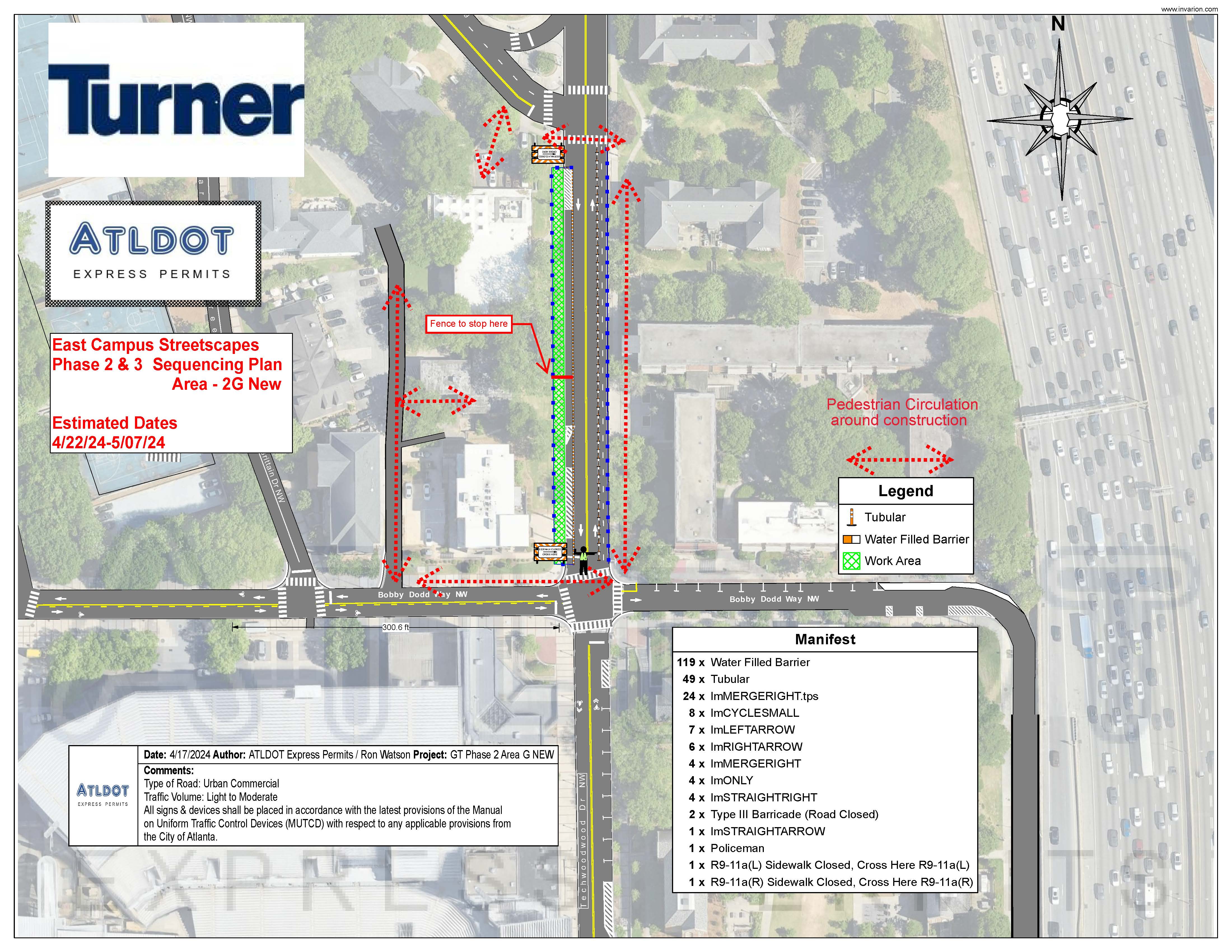 Area G, between Bobby Dodd Way and 4th Street sidewalks and curbs will begin construction with an estimated completion date for this area of May 7. Vehicular traffic north and southbound on Techwood Drive will be designated with centerline and barriers. Please see the attached traffic and sequencing plan for reference.