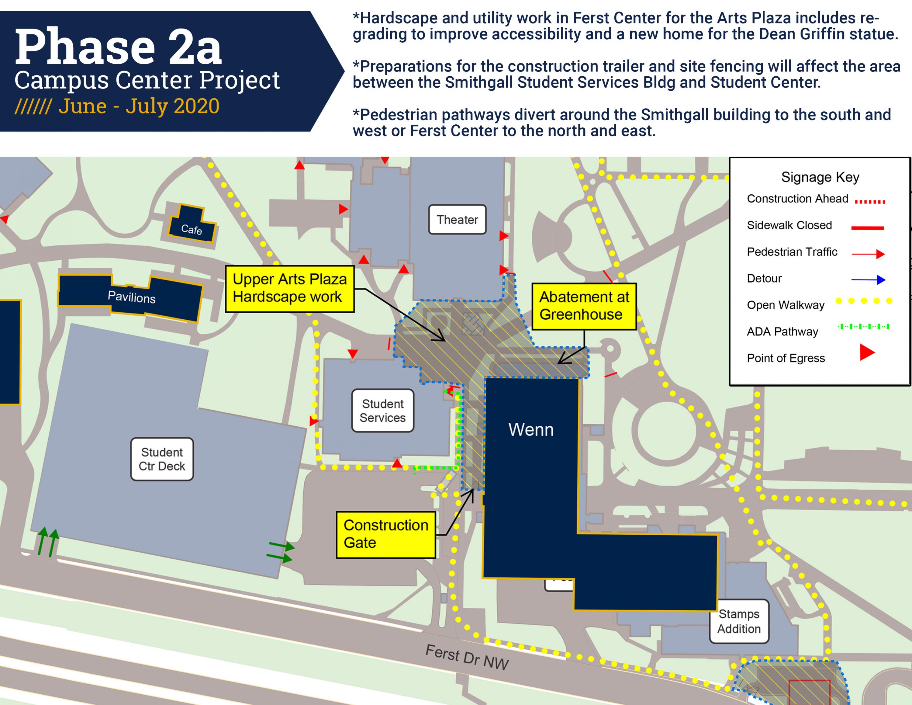 With students and staff working remotely, work can proceed without the need for complex staging and sequencing to maximize construction efficiency and minimize impacts to the community. For those still living or working on campus at this time, pathways through the plaza in front of the Ferst Center have been diverted to the south and west around the Smithgall Student Services Building and to the east around the Student Center and Ferst Center. (See Phase 2a diagram.)